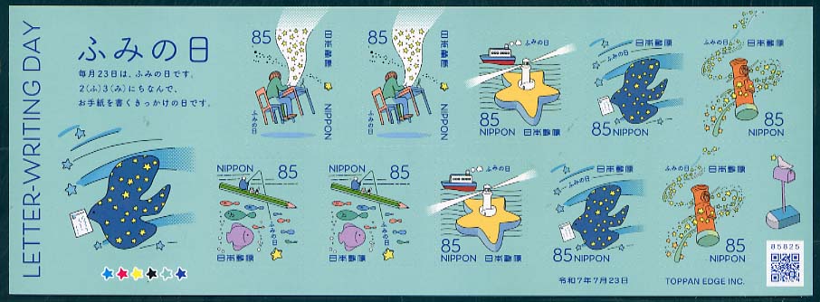 C2623 | ふみの日(85円) | 850 | (a×2、b×2、c×2、d×2、e×2)のシール 式 10 枚 シート | 2025.7.23 | オフセット | 6色 | 60 | シール式 | |||||