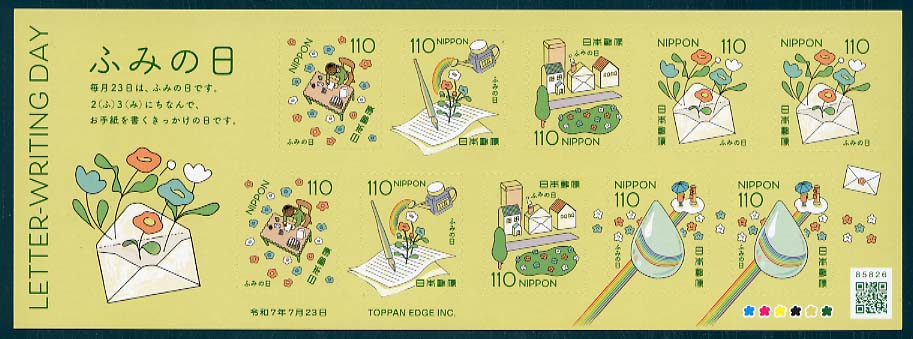 C2624 | ふみの日(110円) | 1100 | (a×2、b×2、c×2、d×2、e×2)のシール 式 10 枚 シート | 2025.7.23 | オフセット | 6色 | 200 | シール式 | |||||