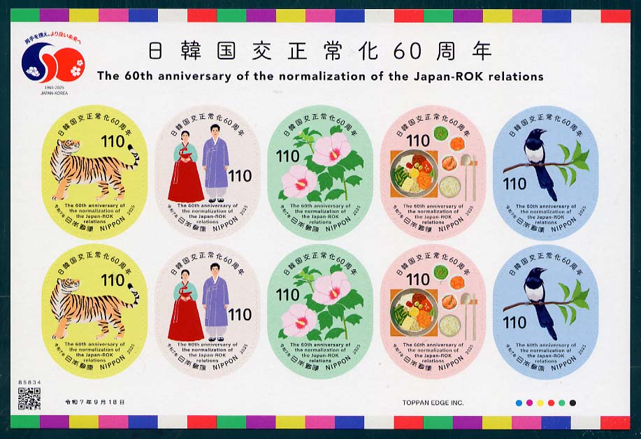 C2627 | 日韓国交正常化60周年 | 1100 | (a×2、b×2、c×2、d×2、e×2)のシール 式 10 枚 シート | 2025.9..24 | オフセット | 6色 | 40 | シール式 | |||||